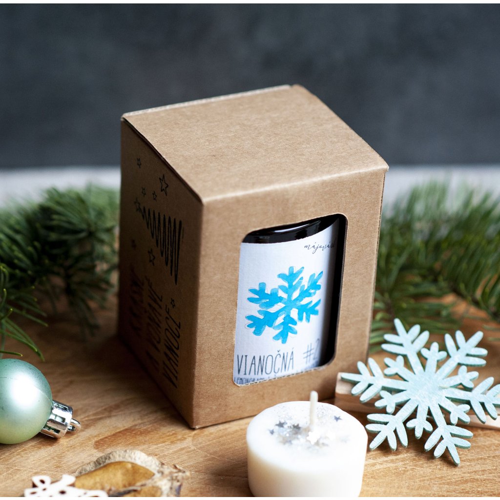VIANOČNÁ #2 je vyrobená zo 100% sójového vosku a 100% prírodných silíc (esenciálnych olejov): lemongrass, škorica, kardamóm. Sviečka je zdobená eko glittrami z prírodnej sľudy.