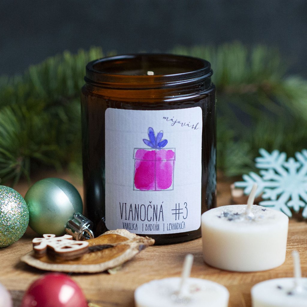 VIANOČNÁ #3 je vyrobená zo 100% sójového vosku a prírodných silíc (esenciálnych olejov): vanilka, badyán, levanduľa. Sviečka je zdobená eko glittrami z prírodnej sľudy.